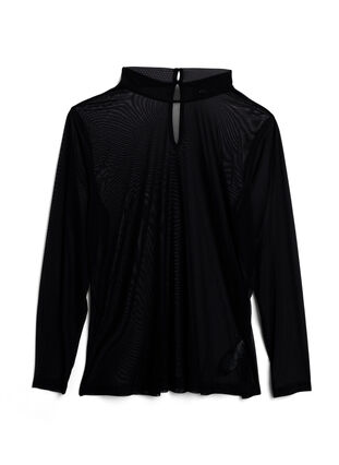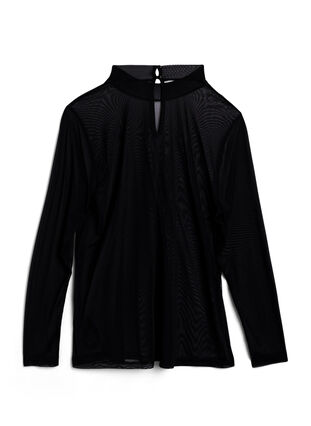 Taillierte Bluse aus weichem und leicht transparentem Mesh mit Stretch. Die Bluse hat lange Ärmel und einen hohen Kragen mit einem Schlüsselloch-Detail an der Rückseite.