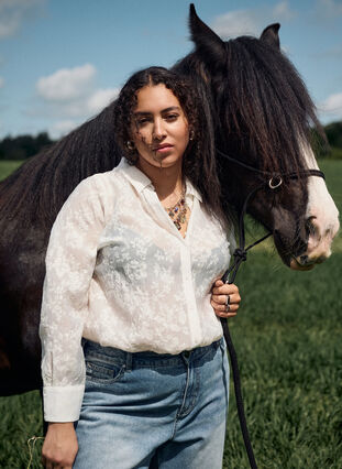 Hemdbluse aus einem leichten und luftigen Material mit Viskose und einem zarten Ton-in-Ton-Blumendesign. Die Hemdbluse hat eine normale Passform mit einem klassischen Kragen, einer durchgehenden Knopfleiste und langen Ärmeln mit Bündchen.