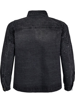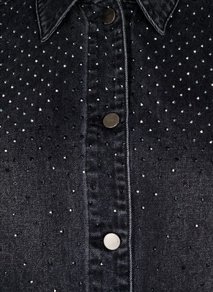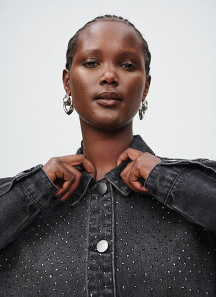 Lässige Jeansjacke mit femininen Details in Form von kleinen Strasssteinen, die über Schultern, Brust und Ärmel verteilt sind. Die Jacke hat eine gerade, lockere Passform mit einem klassischen Kragen, einem Knopfverschluss auf der Vorderseite und großen Vordertaschen. Eine stylische und bequeme Alltagsjacke mit einem Hauch von Glitzer – sie lässt sich einfach mit Jeans, Kleidern und Leggings kombinieren.