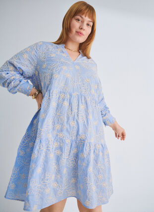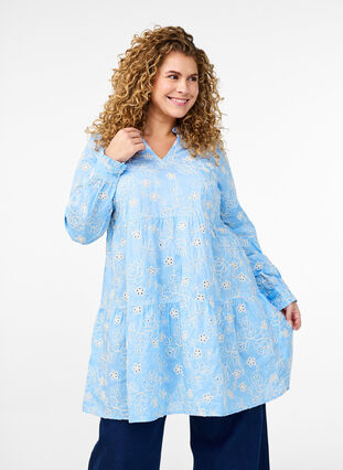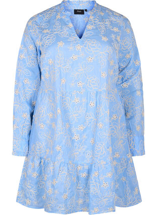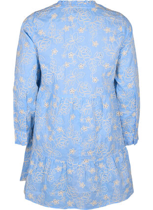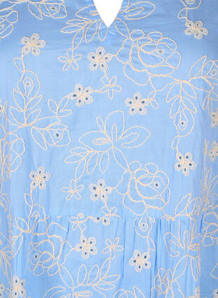 Feminines kurzes Kleid aus 100 % Baumwolle mit gestickten Blumen, V-Ausschnitt und gerüschtem Kragen. Das Kleid hat lange Ärmel mit einem zarten Rüschenabschluss und eine A-Linien-Form mit Nähten, die eine schöne und feminine Silhouette schaffen.