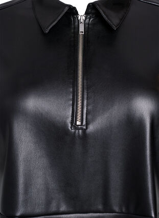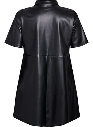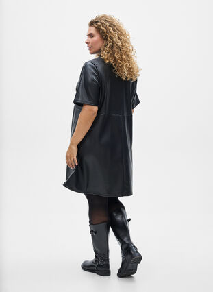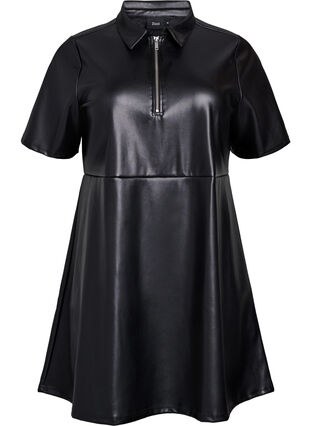 Kurzes Kleid aus Kunstleder mit einer Taillennaht, die eine schöne A-Linien-Silhouette erzeugt. Das Kleid hat einen klassischen Kragen, einen kurzen Reißverschluss auf der Vorderseite und kurze Ärmel.