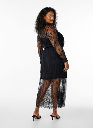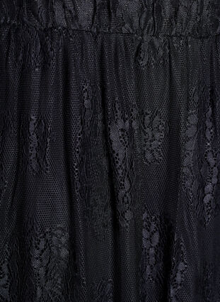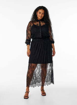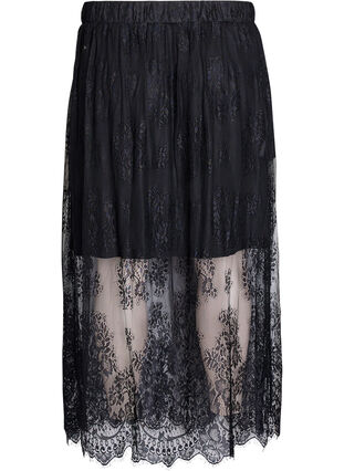 Maxi-Rock aus durchsichtigem Spitzenstoff mit einem gezackten Saum und einer lockeren Passform. Der Rock hat einen elastischen Bund und ein weiches, bequemes Viskose-Innenfutter, das über dem Knie endet und den durchsichtigen Effekt unten verstärkt.