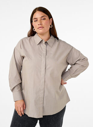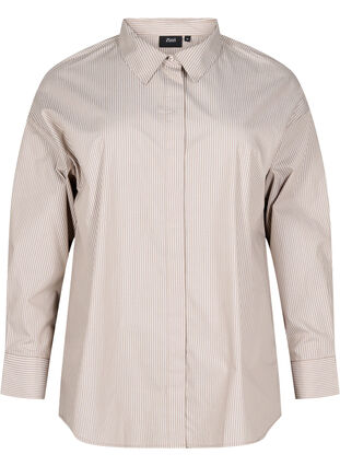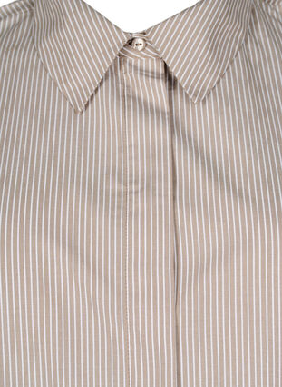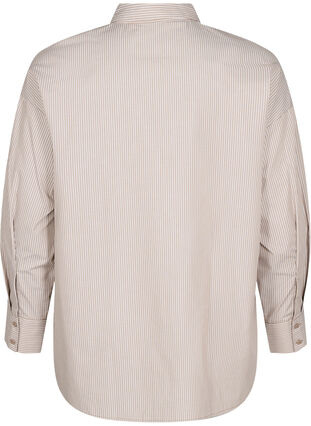 Hemd mit Streifen, Kragen und Knopfverschluss. Das Hemd besteht aus einem leichten Material mit 65 % recyceltem Polyester, hat lange Ärmel mit Manschetten und Knöpfen sowie eine lockere und bequeme Passform.
