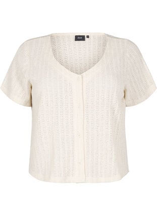 Cardigan mit kurzen Ärmeln, einem Rundhalsausschnitt und Knopfverschluss auf der Vorderseite. Der Cardigan hat eine normale Passform und ist aus einem weichen Jersey mit Struktur.