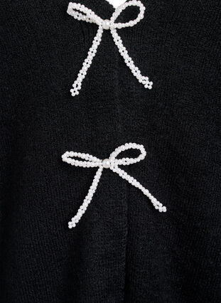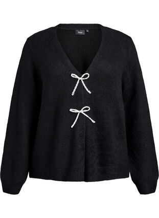 Strickjacke aus einem weichen und bequemen Material mit langen Ärmeln und einem V-Ausschnitt. Diese Strickjacke hat eine lockere Passform und wird vorne mit Druckknöpfen geschlossen. Als nettes Detail ist sie mit zwei abnehmbaren Schleifen aus kleinen Perlen versehen, die ihr einen femininen Touch verleihen. Die Strickjacke hat gerippte Bündchen an Ärmeln und Saum und kann elegant oder lässig gestylt werden.